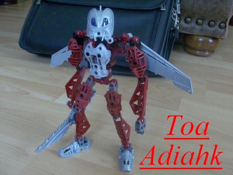 Adiahk wears the Kanohi Tryna, the Great Mask of Reanimation. His weapon is a sword, while he also possesses two Protosteel wings that allow him to fly.