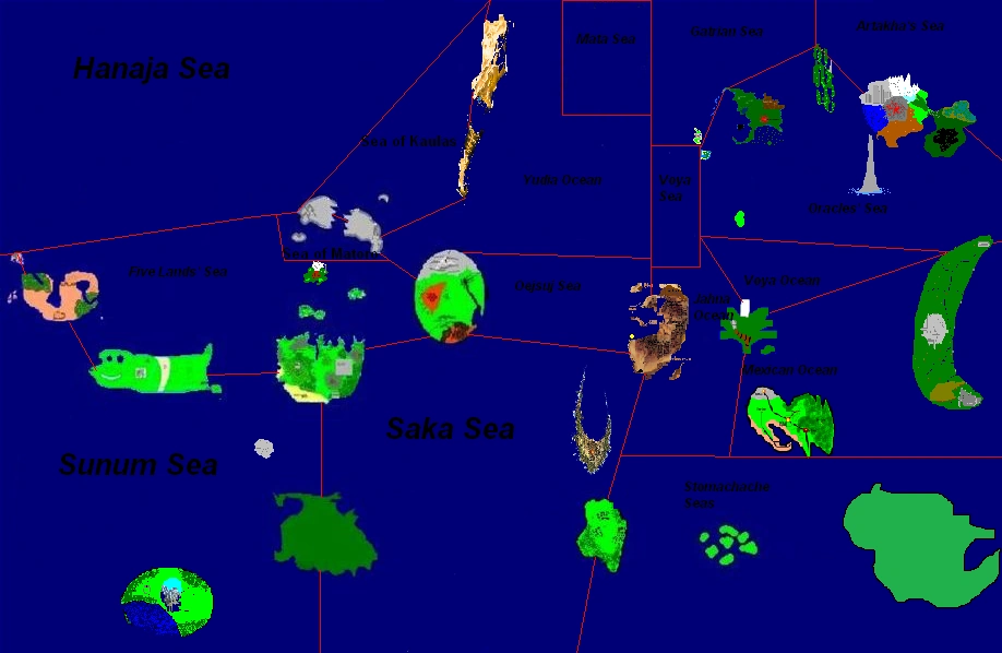 In the prime reality, Aqua Magna had no landmasses, save Voya Nui and Mata Nui, though Mata Nui was destroyed and Voya Nui sank back into the Matoran Universe. However, many fanon islands exist on this world. A map of these may be seen below.