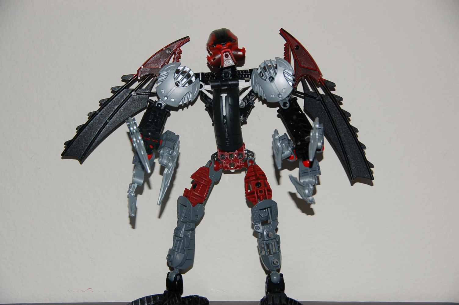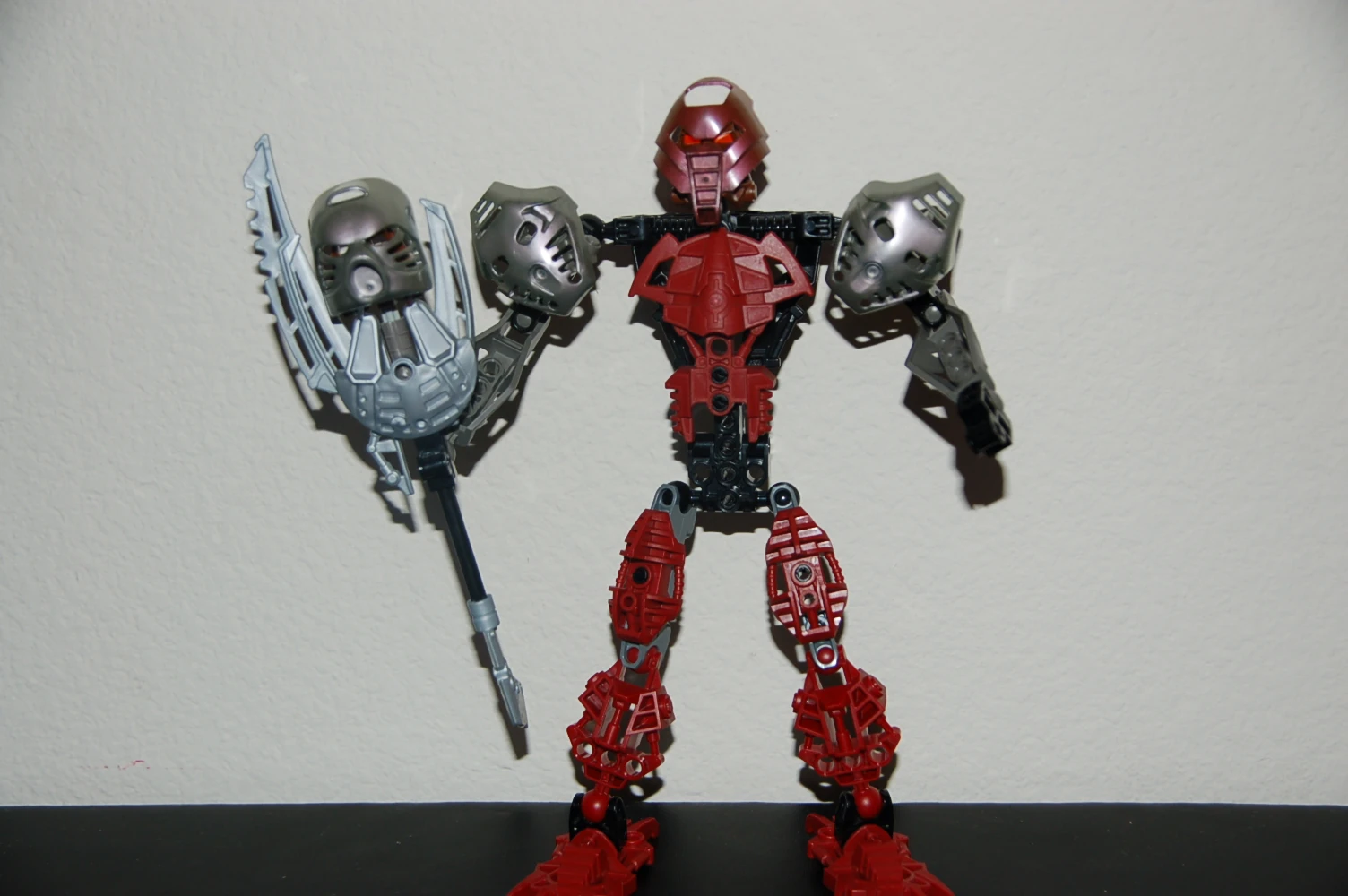 Atrex wore a copper Huna, the mask of concealment. Even though a copper Huna in the prime reality had no power and were trophies, Atrex's copper Huna had powers of concealment and even better control over them. Atrex thought of his mask as a sign of power. He also carried a staff of shielding that was powered by a silver Hau . The staff had the power to create incredibly strong force fields and shoot bursts of energy. Atrex was stronger than most, if not all, the glatorian, making it easier to over power them. As Atrex Nui, he no longer carried his staff of shielding and had huge claws made of the strongest protosteel. He gained control over new powers such as, chain lighting, acid rain (weather control), shattering, and mind control. His copper huna was transformed into the Kanohi Morrtix, the mask of suffering. The Morrtix increased the strength of Atrex Nui's new powers, making them more painful to the one they were used on. The mask also gave him the ability to make a person see his worst nightmare, only to wake up and find the nightmare had become reality.