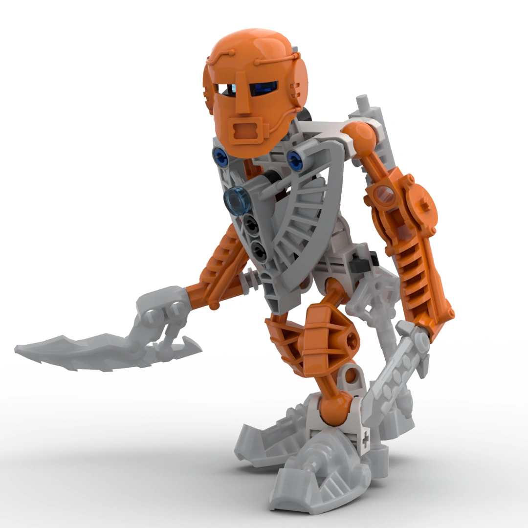 After Mahri Nui sunk into the Voya Nui Bay, the small amount of mutagen he was exposed to gave him a stronger, sleeker form more suited to his new environment. He wears a battered orange Kanohi Mahiki, and wields a variety of daggers, short blades and an electro-blade.