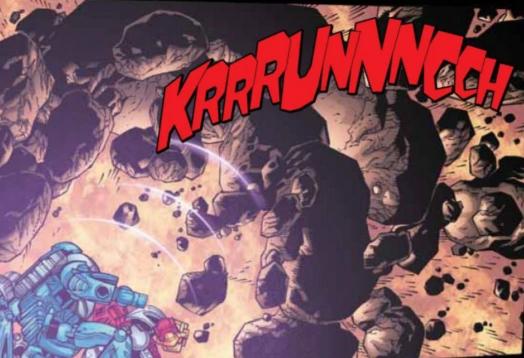 Tahu using his Hau Nuva to protect the Toa Nuva from falling debris.