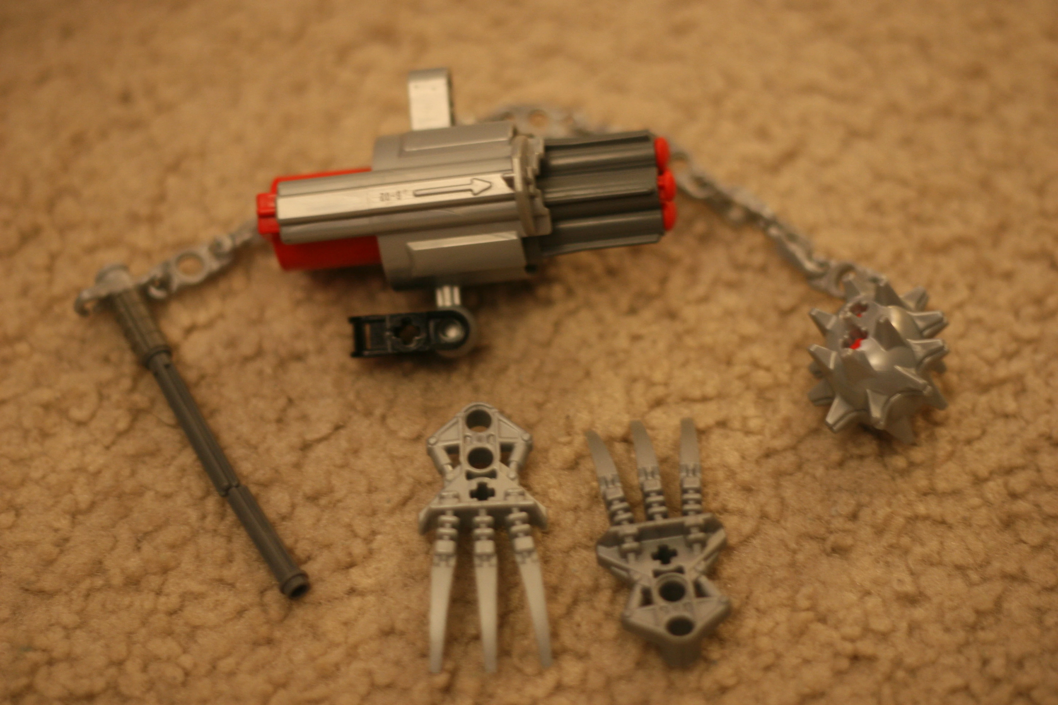As a Matoran, Hewkii carried a Disk Launcher, along with several disks. When he became a Toa, he recieved Wrist Claws and a Morningstar, which could be used to channel his control over Stone. He also carried a shoulder mounted Cordak Blaster.