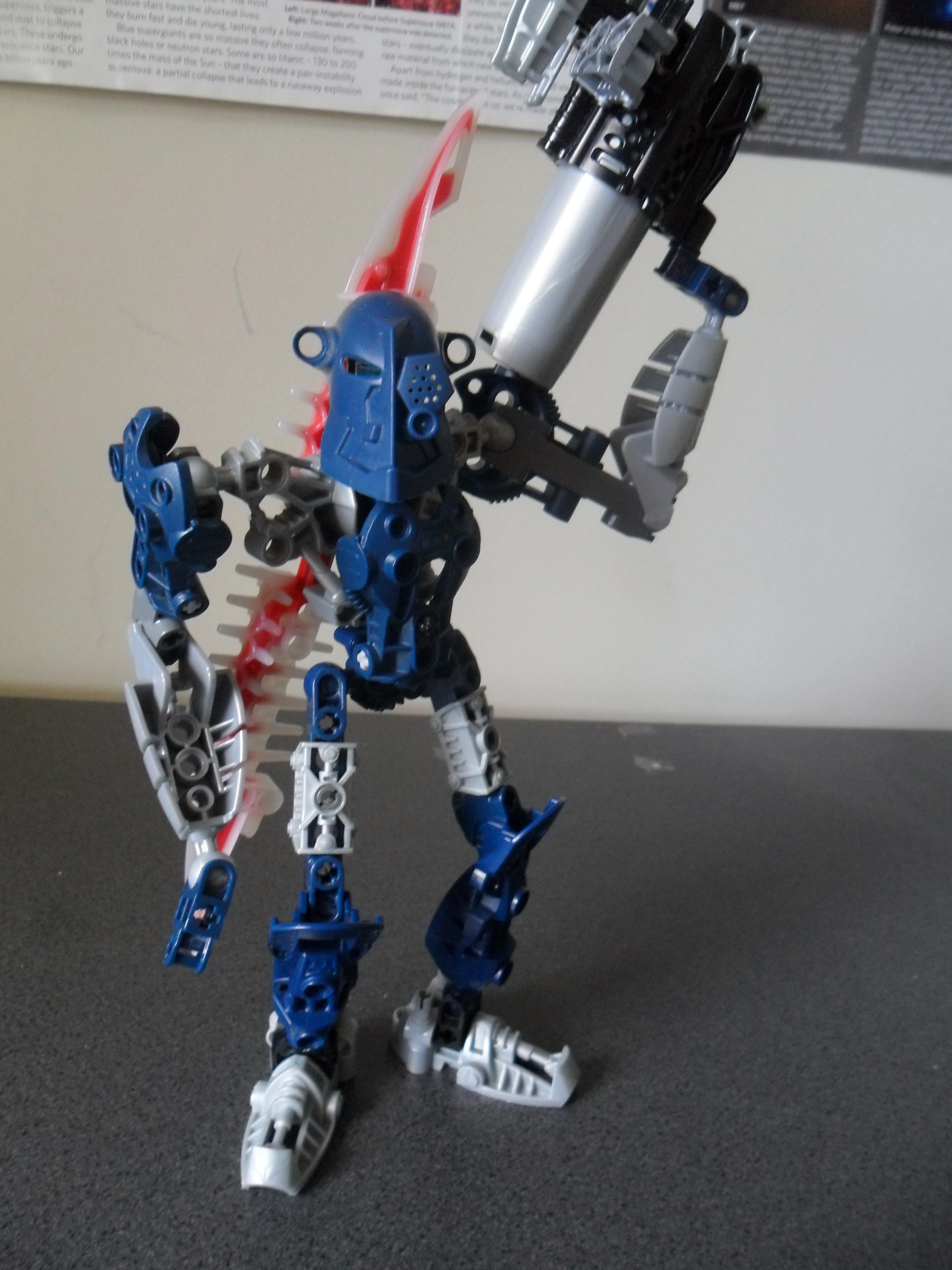 With her Rapid-Fire Energy Gun and Double-Bladed Sword Indra uses a unique form when fighting. She combines quick blasts with sword attacks, incorporating her elemental Water powers as well. Her Energy Gun is able to fire energy blasts strong enough to temporarily paralyse a Makuta. It is also able to fire 100 shots in 10 seconds; however, the gun needs to recharge after this and has considerable recoil.