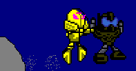 Kikka pushing Grandeg's Elite Robot off the cliff, falling down himself too