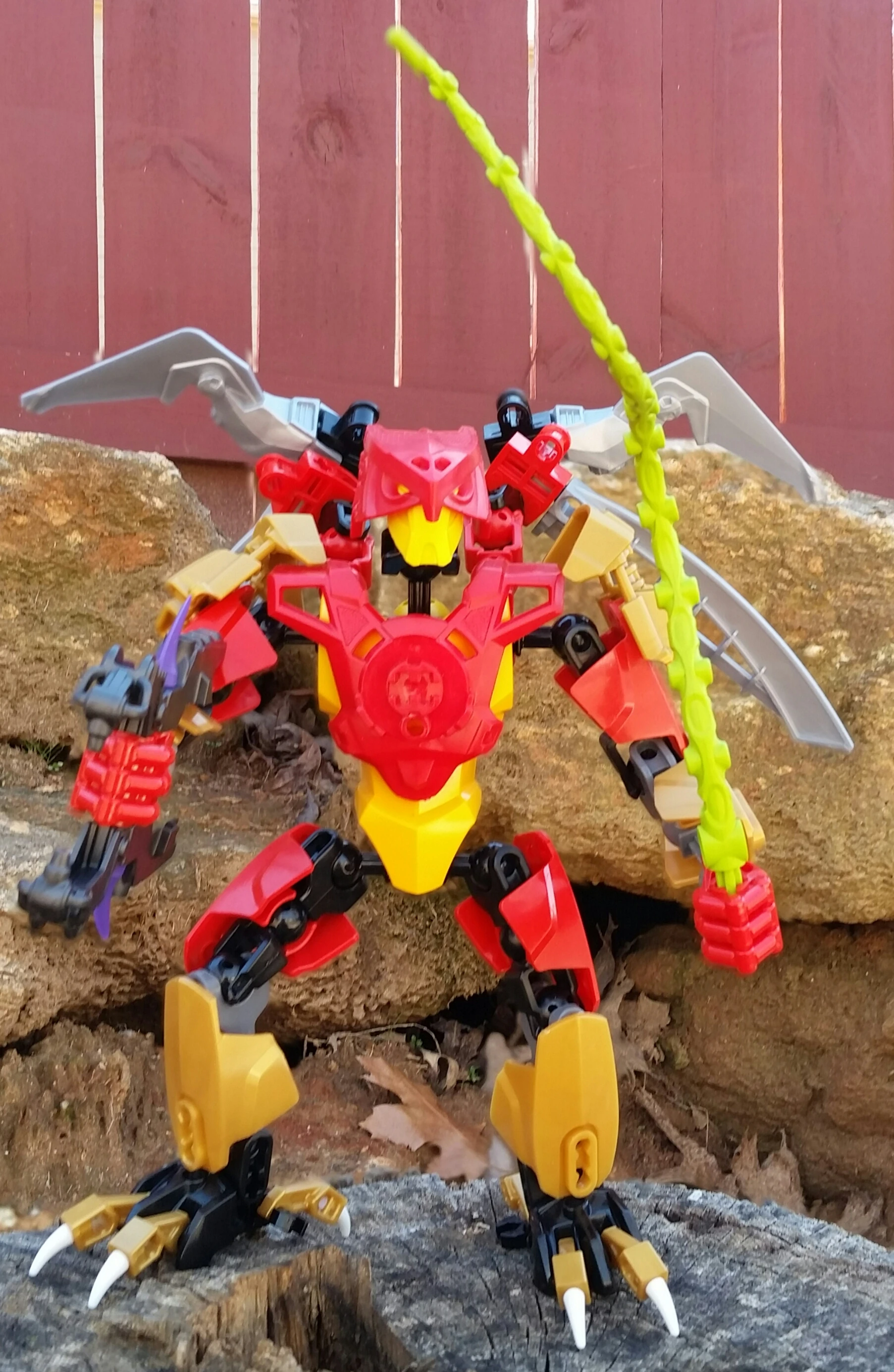 Laserbeak carries a green whip and a Mutation Blaster. His whip is useful for grappling things and restraining creatures. His Mutation Blaster was developed by Bonehead and Neverest. The blaster works by having two points facing each other, so the energy can converge into one point. Then, the mutation builds into an orb that can be charged for up to six seconds. After six seconds, the orb automatically fires. Bonehead and Neverest designed this as a failsafe to prevent harm to the user. Laserbeak also has razor-sharp talons on his feet. He often perches on the shoulders of his victims and digs the talons in to the victim's armor. Laserbeak is very strong and can lift large objects merely with his feet. Of course, his powers of flight allow him to do this.
