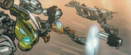 Reuniting in Po-Wahi, the Toa each recounted how their Suvas had been raided under mysterious circumstances. While they lamented the loss of their elemental capabilities, the Toa Nuva were ambushed by the Bohrok Kal, who made clear their objective to re-awaken the Bohrok Swarms and raze the island. Determined to defend the island, the Toa engaged the six Bohrok only to be ultimately overwhelmed and outmatched by the combined might of their adversaries. Subdued by non-lethal means, the Toa were left unconscious in the sand, only to awaken many hours later after a crushing defeat at the hands of the Bohrok Kal. Now firm in their conviction, the Toa Nuva set about defending their villages through whatever means necessary.