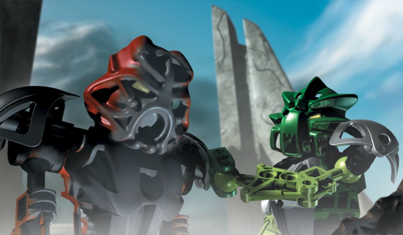 Presuming the Makuta to have been vanquished and the struggle to be over, the Toa considered parting the company of each other and once more returning to their homes. However, a brief encounter with a Ta-Matoran trapped beneath a tree branch revealed that the settlement of Ta-Koro was under siege by a mysterious new adversary known only as the Bohrok. Travelling to the island's volcanic region, the Toa united in defense of the village, ultimately managing to overwhelm the advancing swarm of Tahnok units through use of their combined Elemental Powers. Upon the inspection of one such unit after the battle, the Toa were approached by Turaga Vakama, who revealed the functionality of the Bohrok and informed them of the various breeds of Krana housed within their adversaries. Intent on collecting all eight variants of Krana breeds from the six types of Bohrok, the Toa parted ways once more.