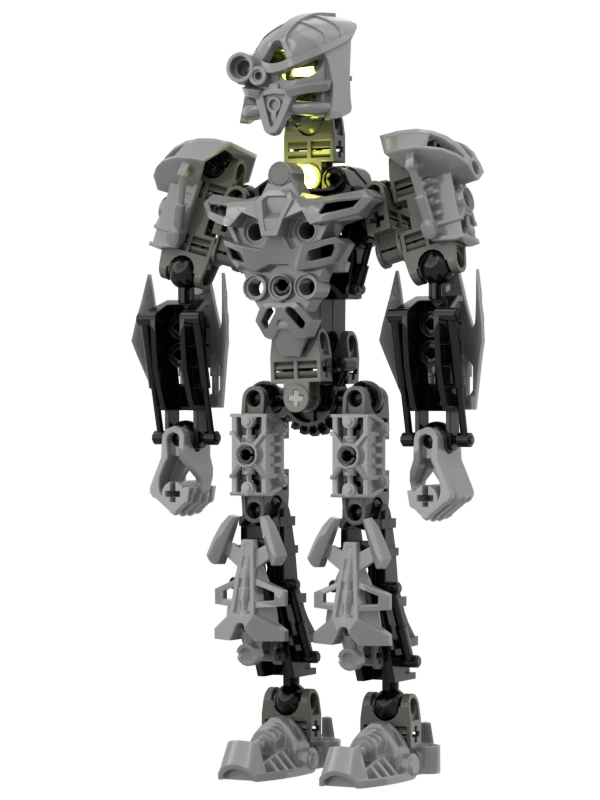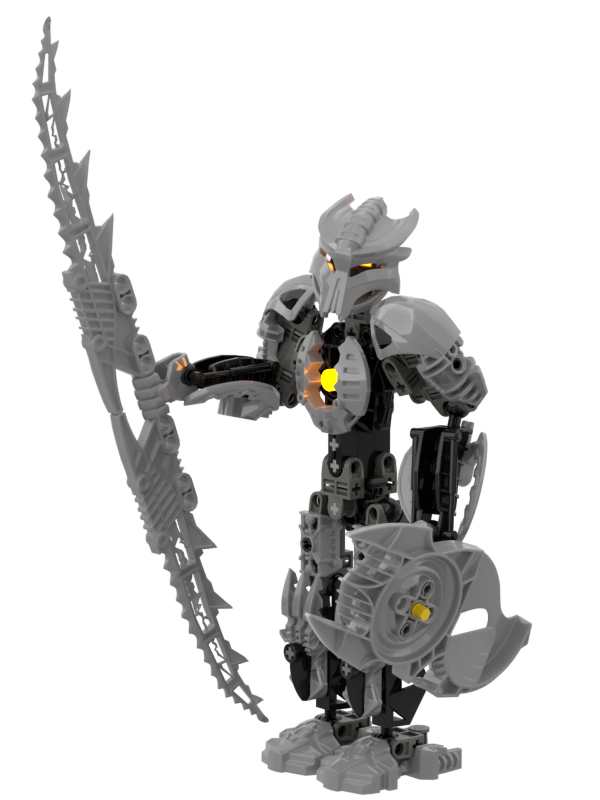 What mask and tools he had as a Matoran are unknown. He is known however to have wielded a Candle Spear and Rhotuka Launching Shield as a Toa Hagah. His Kanohi of choice at the time was a Shelek, Mask of Silence. He would replace this mask with a Felnas, Mask of Disruption following the desolation of his former team. He traded in his spear for a Hexer's Twinblade, a weapon that allowed him to draw out his inner darkness in the form of energy blasts.