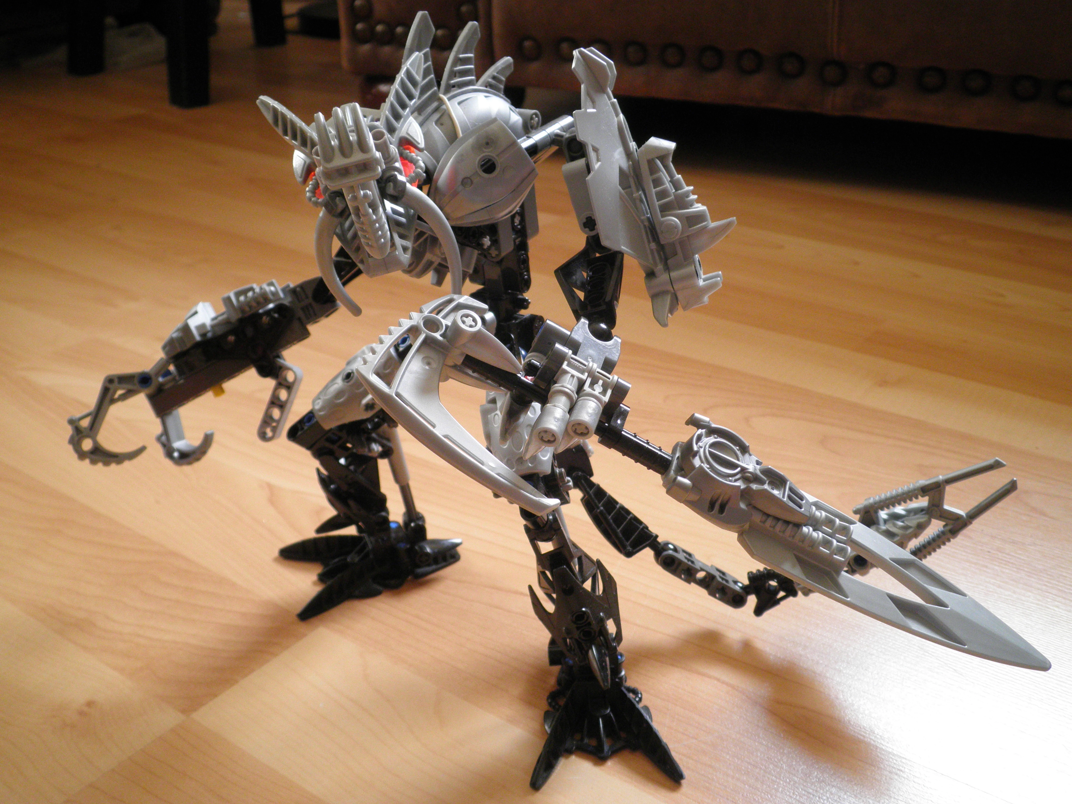 His right hand - almost completely mechanical in nature - ends in a trio of large, metallic claws, and is equipped with a Rhotuka Launcher, though his Rhotuka power is unclear. Morkain is also known to carry a launching weapon of of his own design, though its exact function isn't currently known either.
