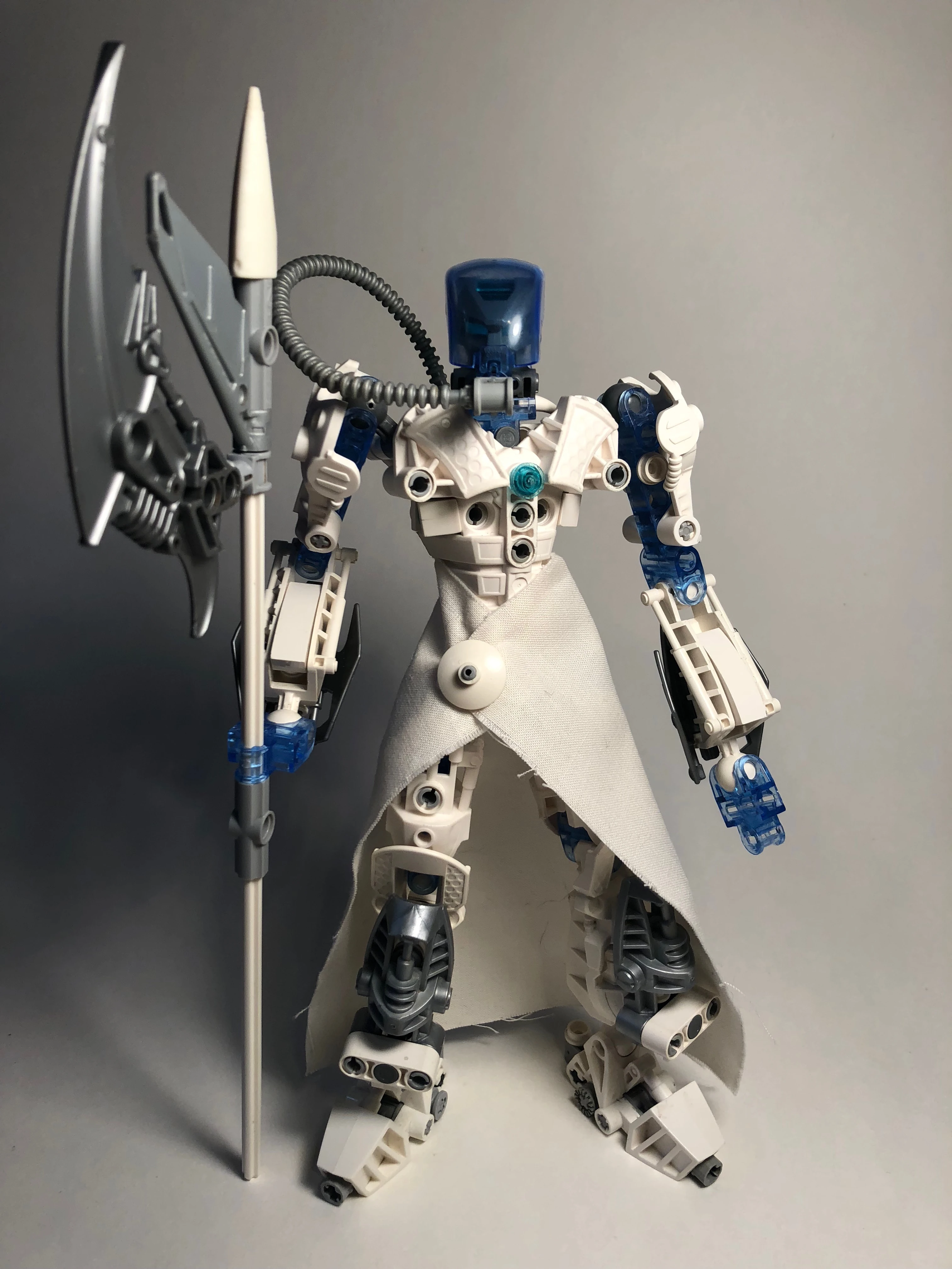 As a Ko-Matoran, Navahko’s eyes and heartlight were light azure, and he wore white, grey, and crystal blue armor. Upon becoming a Supervisor for the KCO, parts of his armor were painted gold, as per protocol.