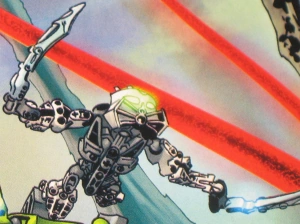 Following the arrival of the Toa Nuva, however, the Makuta were repelled from the skies of Karda Nui and forced to regroup. With Toa Kopaka, Pohatu and Lewa remaining to defend the Stalactite Villages while Tahu, Gali and Onua ventured to the Swamp of Secrets below, Solek would witness Tanma begrudgingly take over leading the Av-Matoran tribe in Kirop's stead.