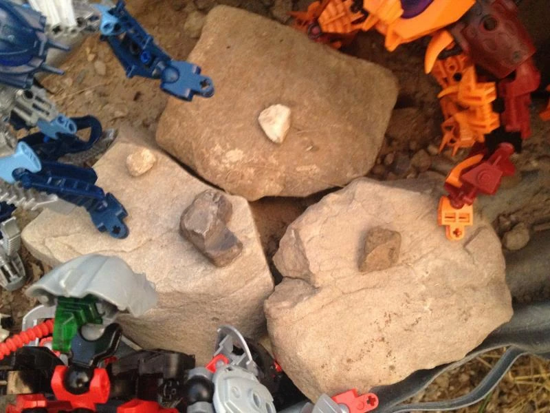 "Okay, so this is an improvised map of the Plains. That tan rock closest to me is us, just there for reference. The white rock is where the River cuts into a meadow, the dark rock is the Shade Forest, where Navahko and Wreshi were, the gap in the table is Lake Faradi and the brown one is what was a garden."
